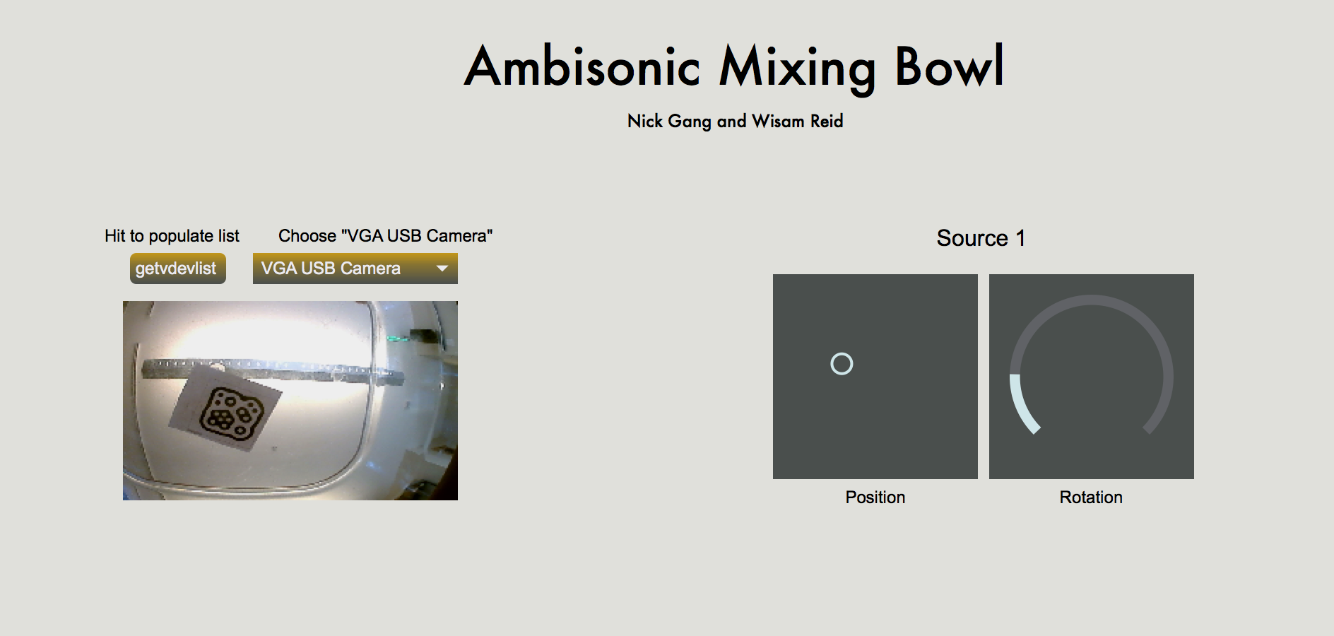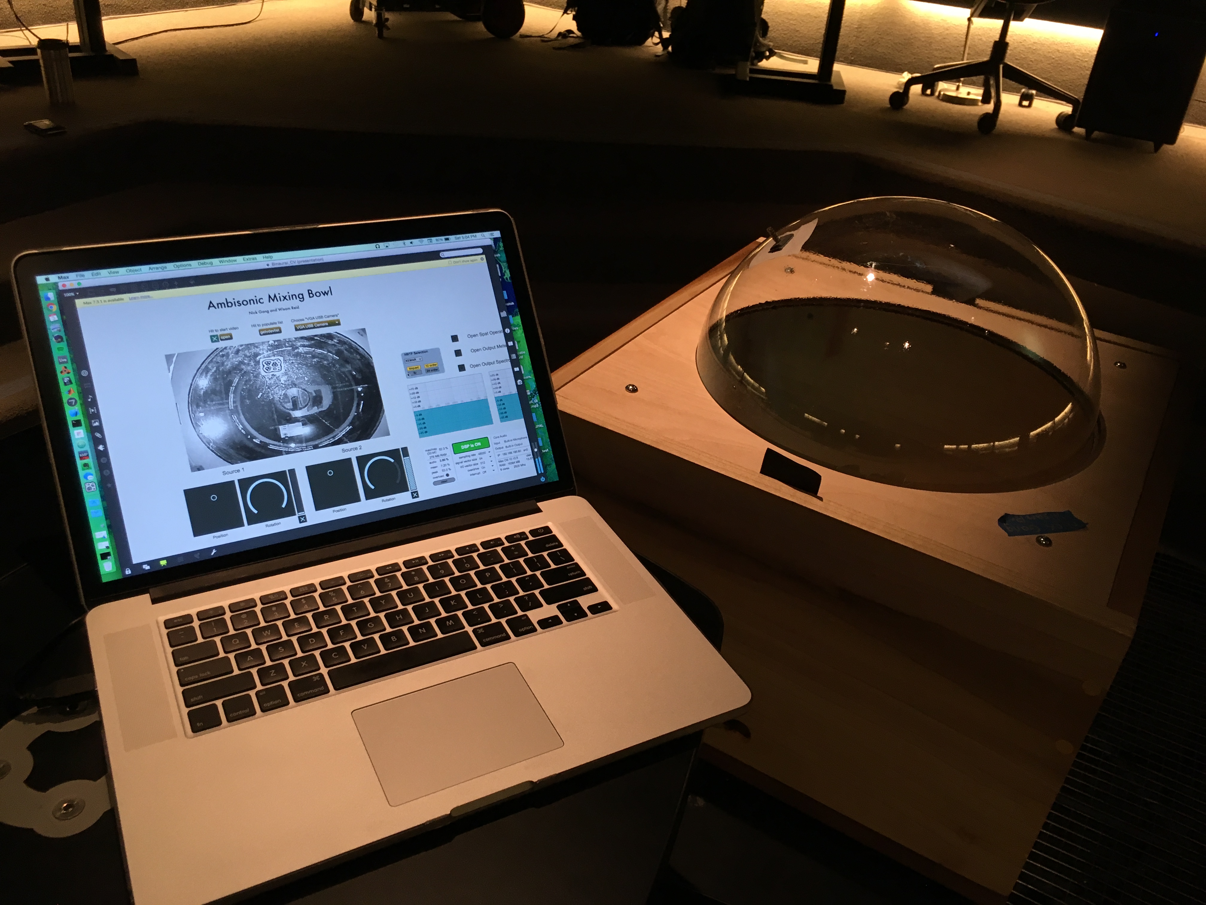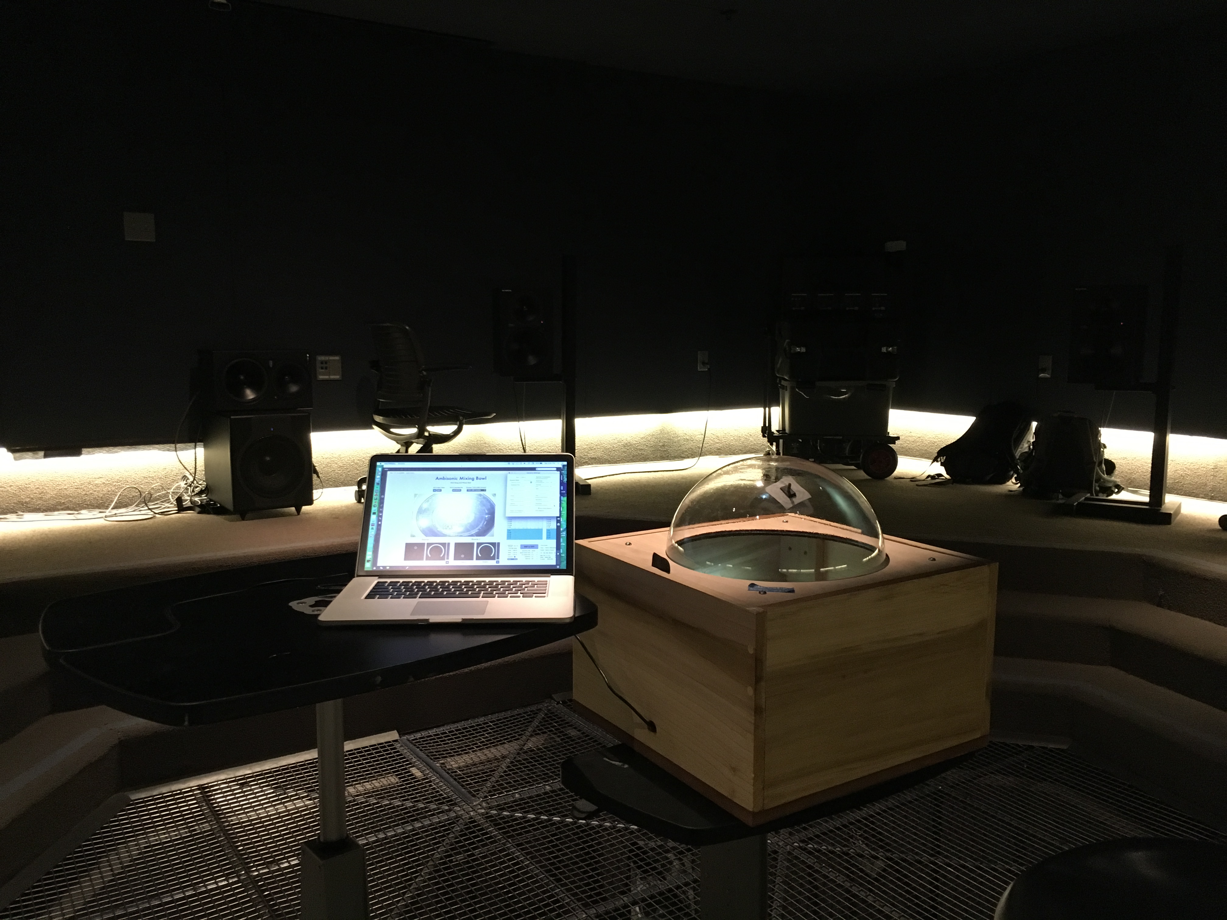 This project seeks to provide spatial audio artists and engineers with a tactile interface for real-time ambisonic panning. Users move and rotate physical magnetic objects around the surface of an acrylic dome. Positions and angles of rotation are tracked with an under-mounted camera and lighting system, processed with reacTIVision’s open source computer vision software, and sent to Spat to control the spatialization. The dome’s spherical shape mimics possible source locations surrounding the listener. The sound source symbols inform the user of the state of the system, and allow for immediate changes in three dimensions with one gesture.