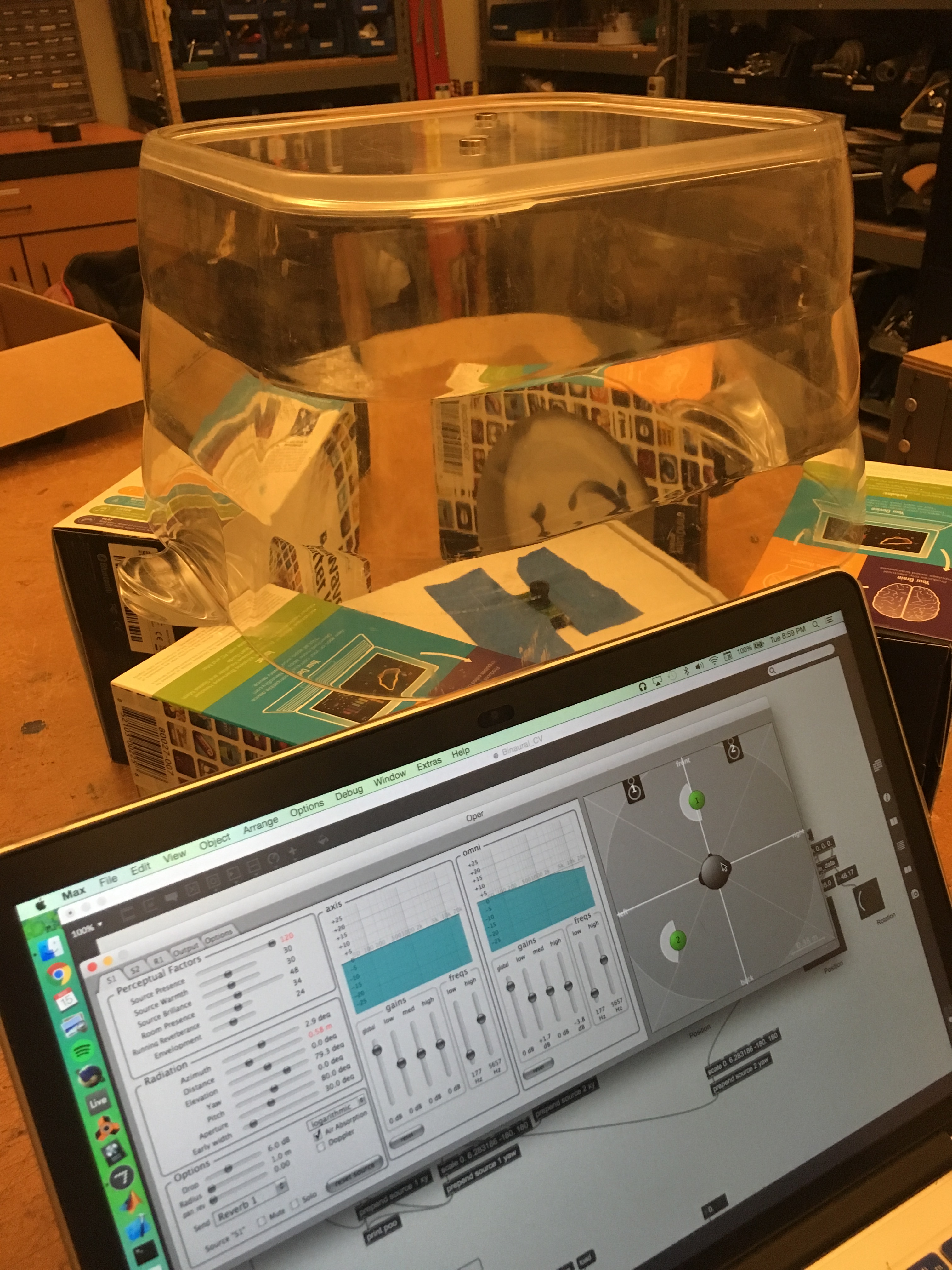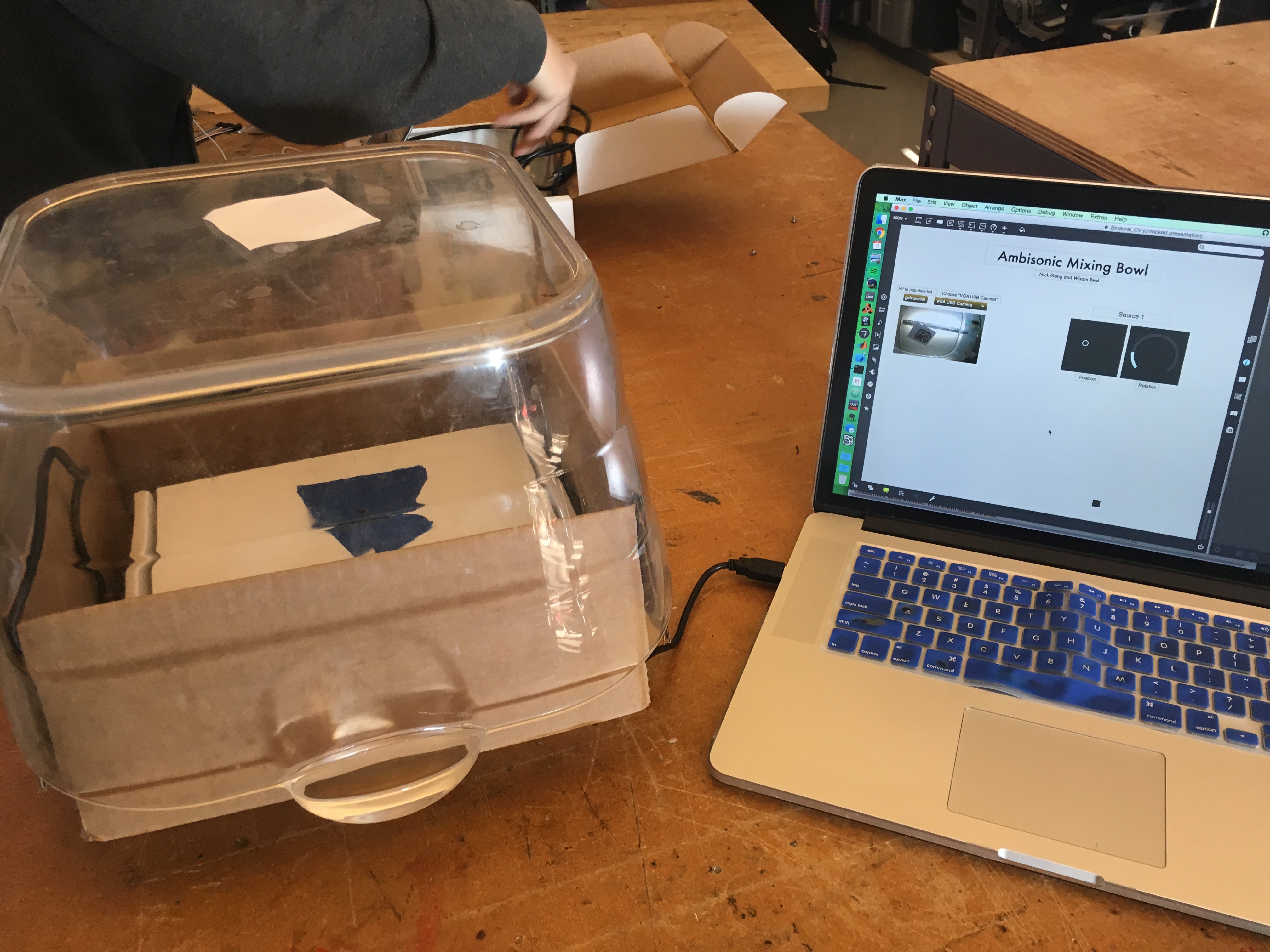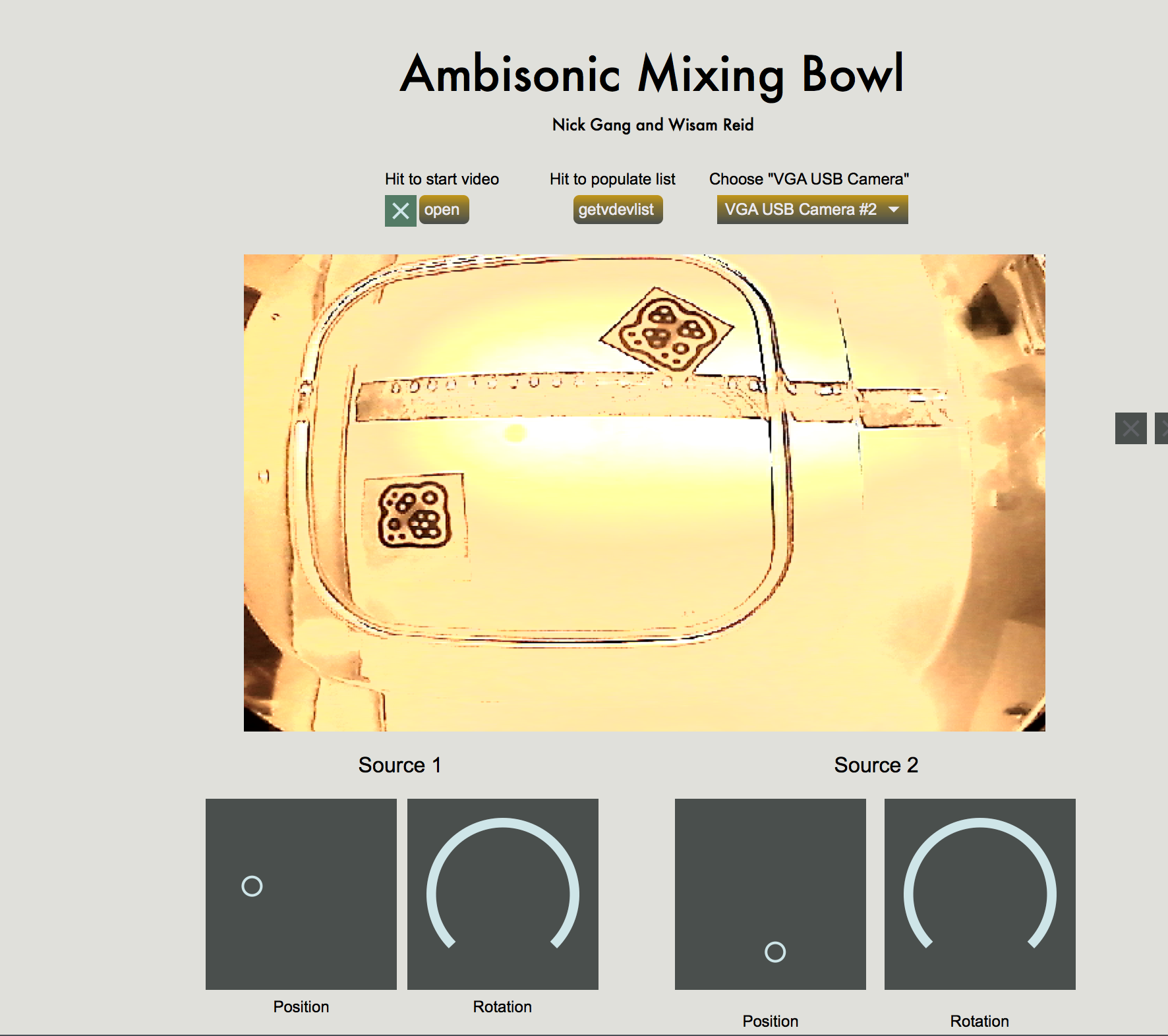 This project seeks to provide spatial audio artists and engineers with a tactile interface for real-time ambisonic panning. Users move and rotate physical magnetic objects around the surface of an acrylic dome. Positions and angles of rotation are tracked with an under-mounted camera and lighting system, processed with reacTIVision’s open source computer vision software, and sent to Spat to control the spatialization. The dome’s spherical shape mimics possible source locations surrounding the listener. The sound source symbols inform the user of the state of the system, and allow for immediate changes in three dimensions with one gesture.